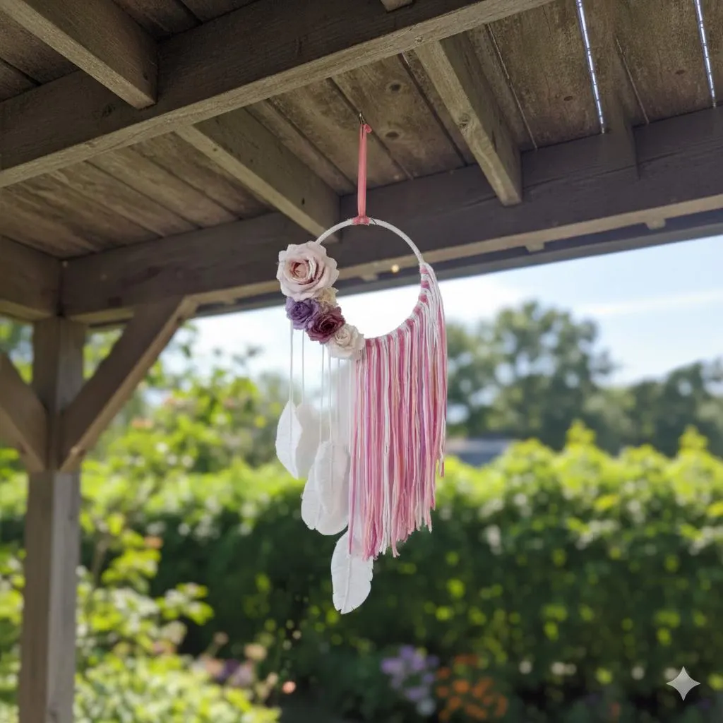 Bohemian Dreamcatcher with Soft Yarns and Floral Accents - Handcrafted 22" Boho Wall Hanging for Home Decor
