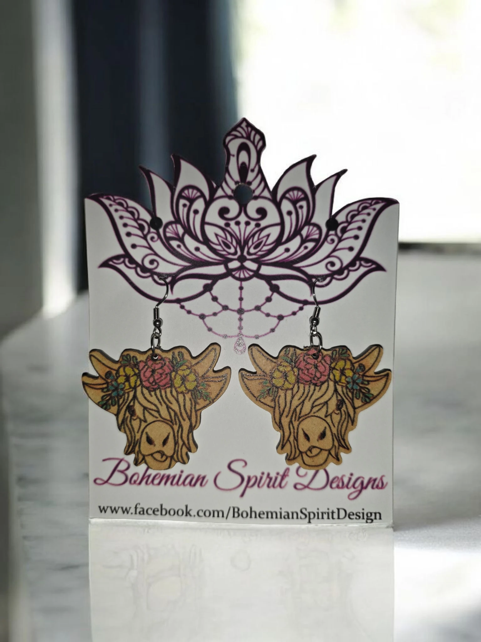 Wooden Floral Hyland Cow Earrings