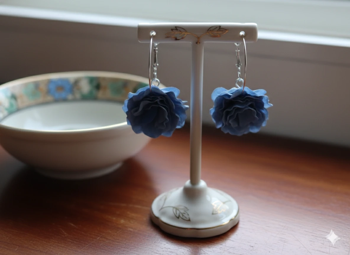 Blue Fabric Flower Hoop Earrings, Silver Plated Floral Jewelry for Weddings or Special Occasions