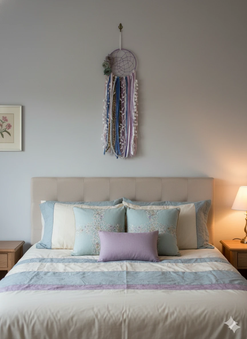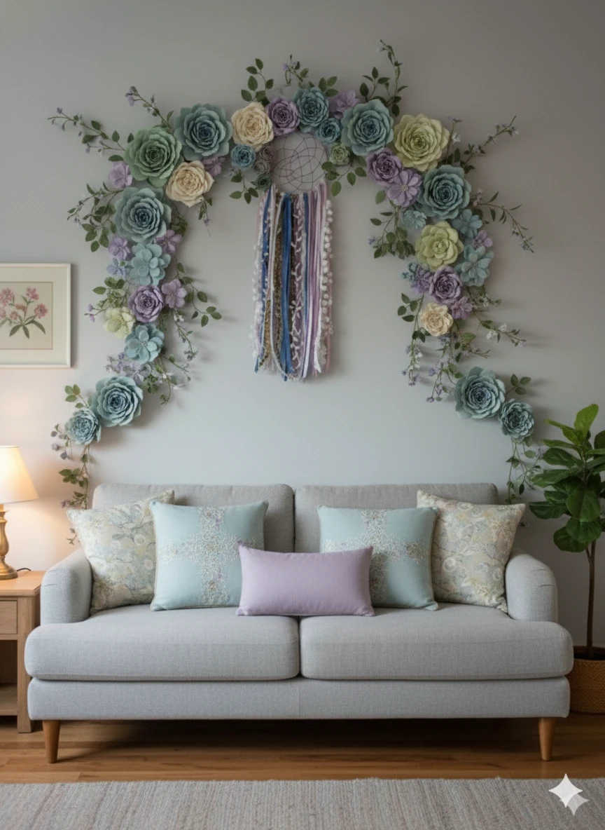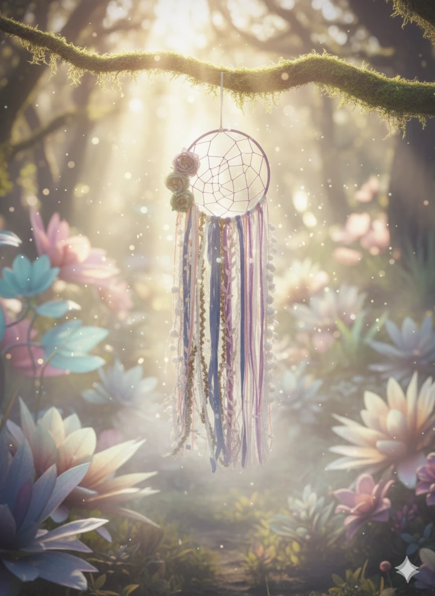 This striking 26-inch handcrafted dream catcher is designed with a beautiful blend of soft, flowing yarns, delicate vines, and gentle floral accents. It is a stunning, oversized piece that adds authentic bohemian charm to any space.